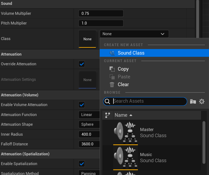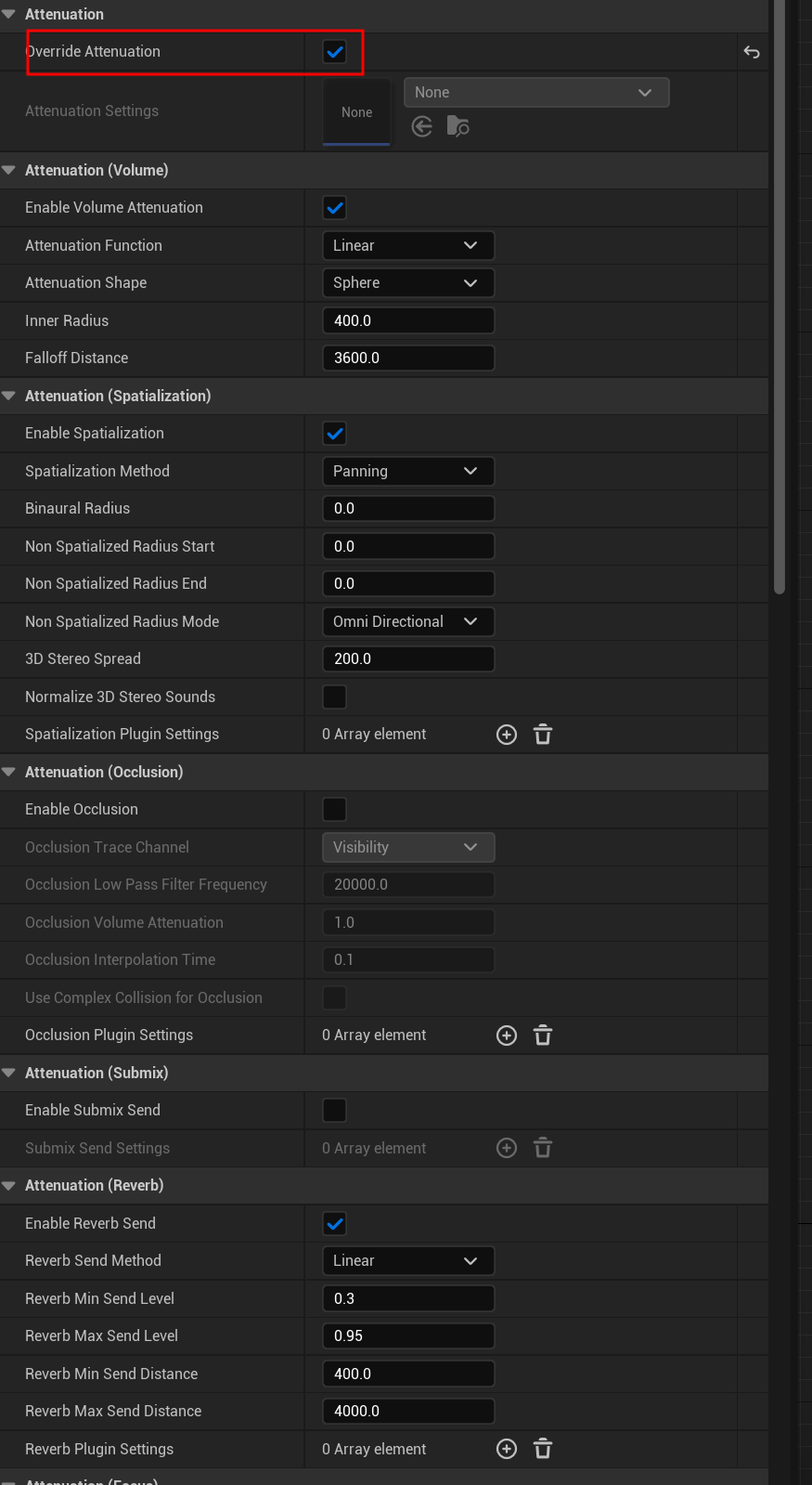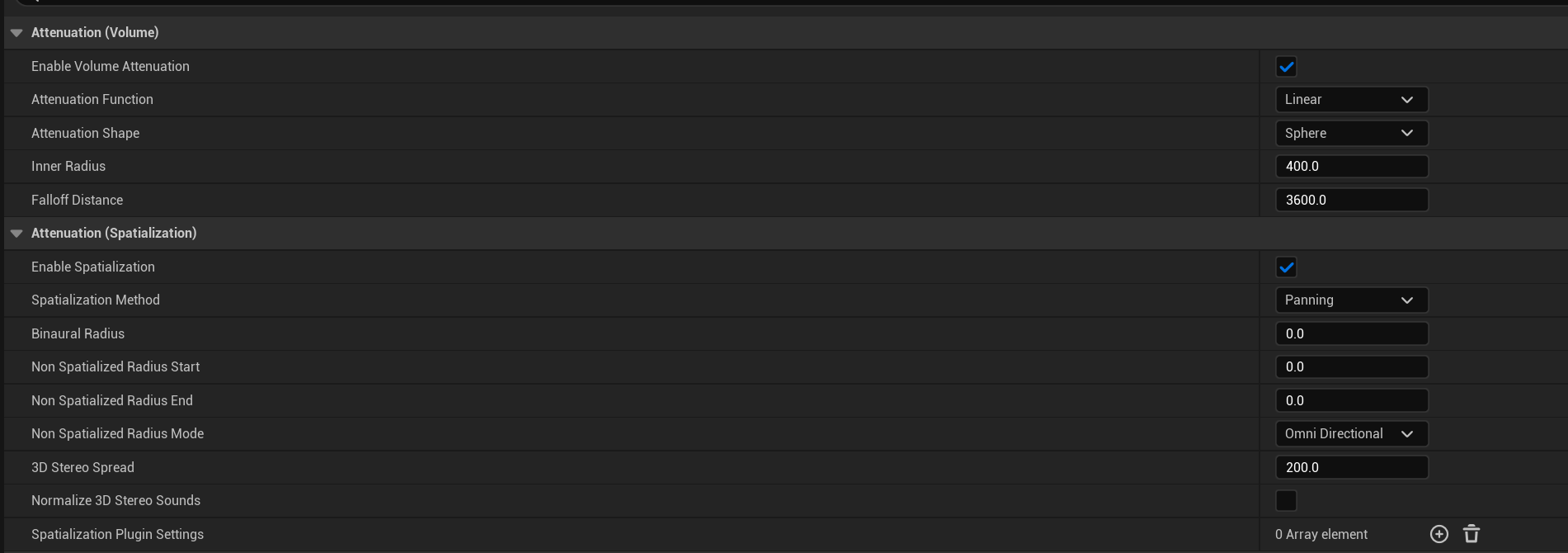 해당 세팅 에셋은 충격사운드 큐에도 적용해주고, 직접 테스트를 통해 값을 설정해주자.