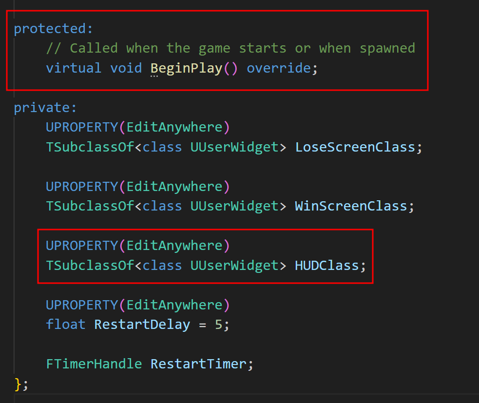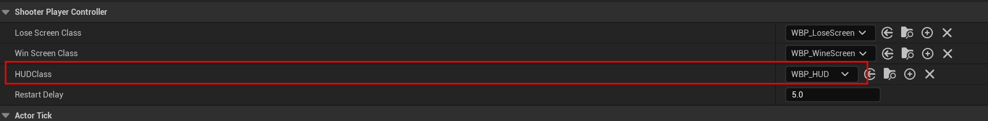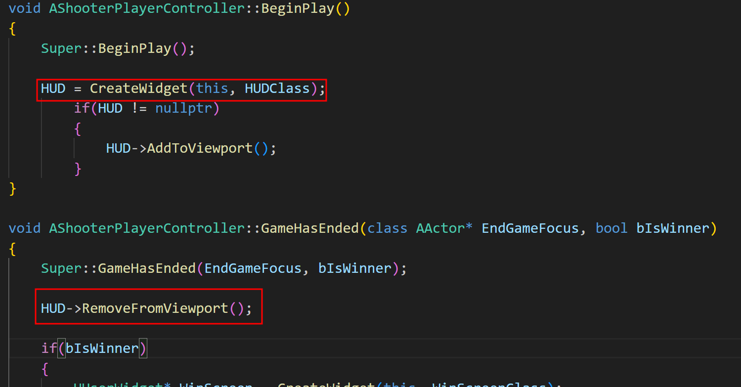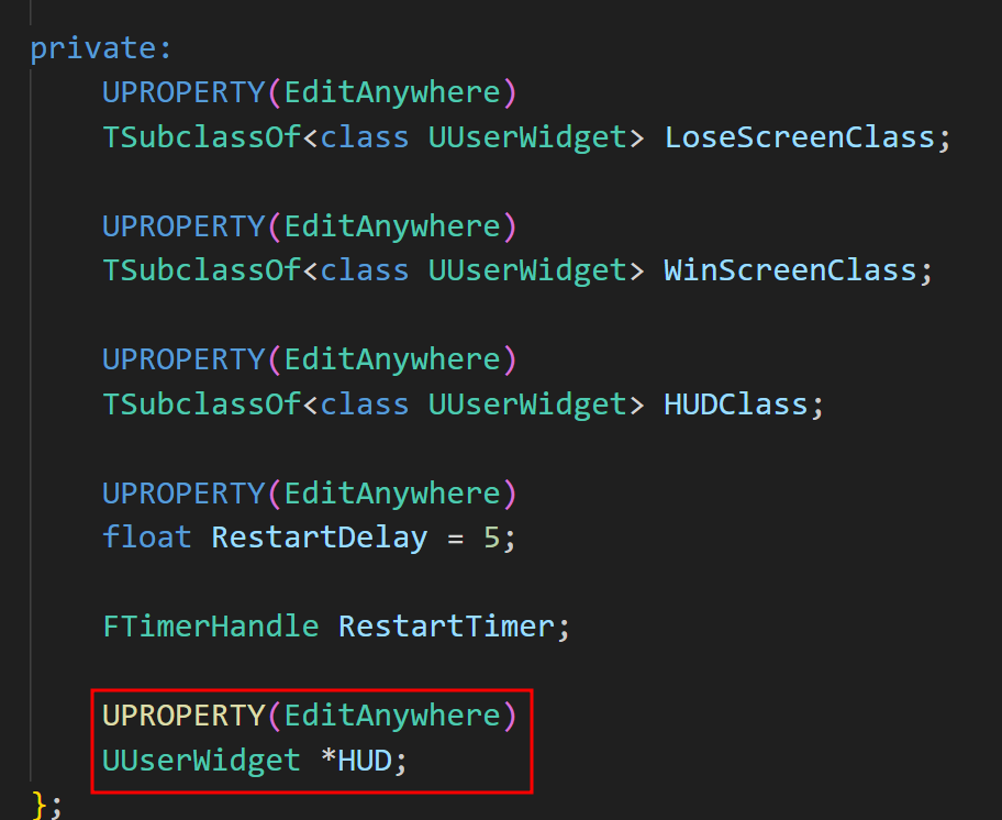 이를 위해 기존에 BeginPlay에서 선언했던 UUwidget* HUD를 헤더에 선언하여 클래스 내의 다른 함수에서도 접근이 가능하도록 해주자.