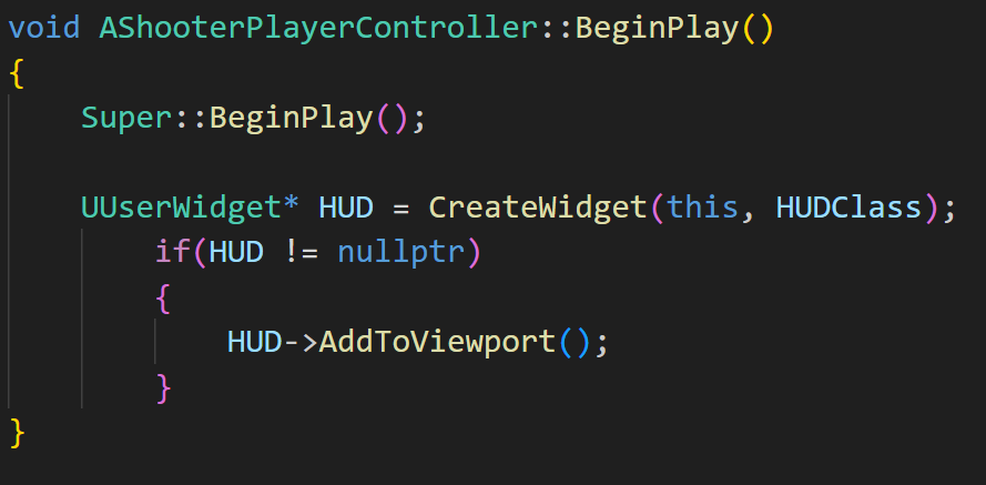 크로스헤어는 게임 시작할 때부터 있어야 하므로 BeginPlay 함수 내에 생성해주어야 한다.