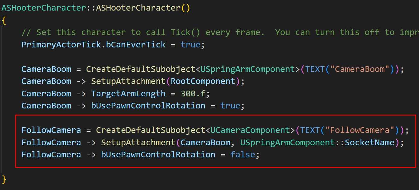 카메라의 경우 플레이어와 같이 회전하면 안되므로, bUsePawnControlRotation을 false로 할당해준다.