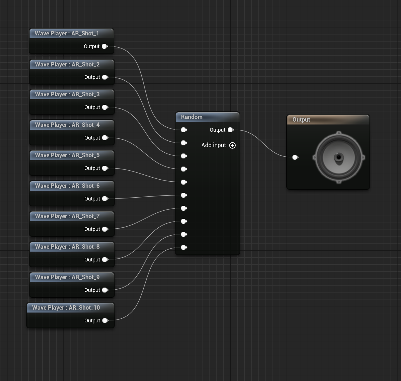 이제 BP ShooterCharacter 클래스에 사운드 큐를 할당하고 실행해보면 좌클릭 시 랜덤한 10개의 총기 사운드를 들을 수 있다.
