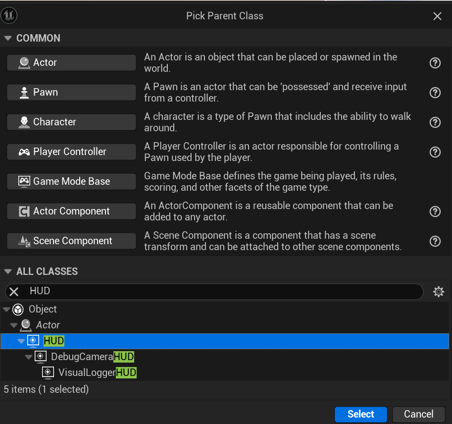 그리고 블루프린트 HUD 클래스를 생성해주자.