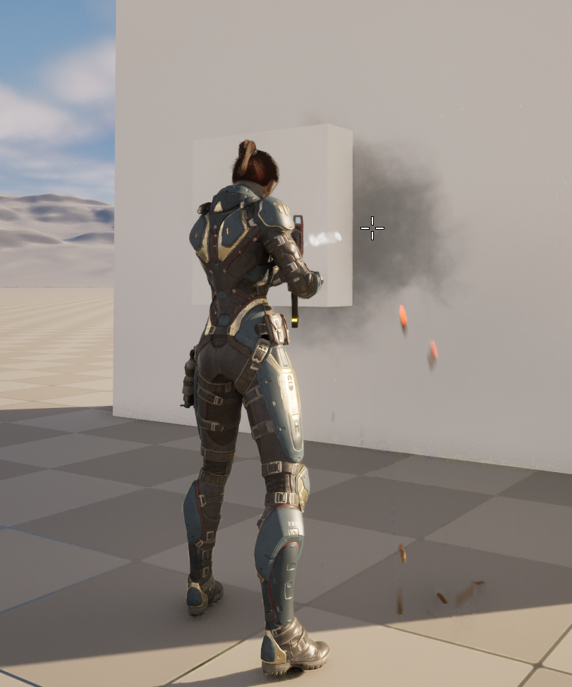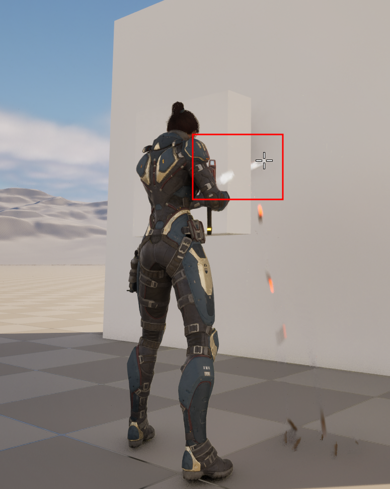 만약 현재 큐브 앞에 또다른 큐브를 위치시키고 크로스헤어를 앞의 큐브 바로 옆에 위치시켜 사격할 경우 실제론 앞의 큐브에 부딪히지만 멈추지 않고 뒷 큐브까지 사격이 도달하는 모습을 볼 수 있다.