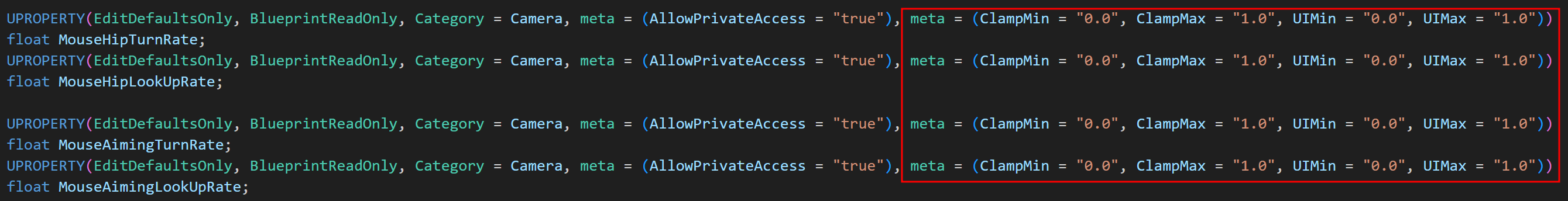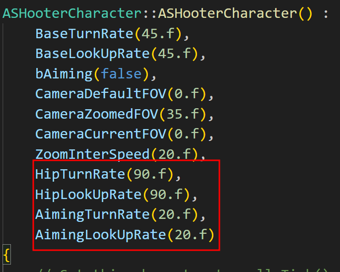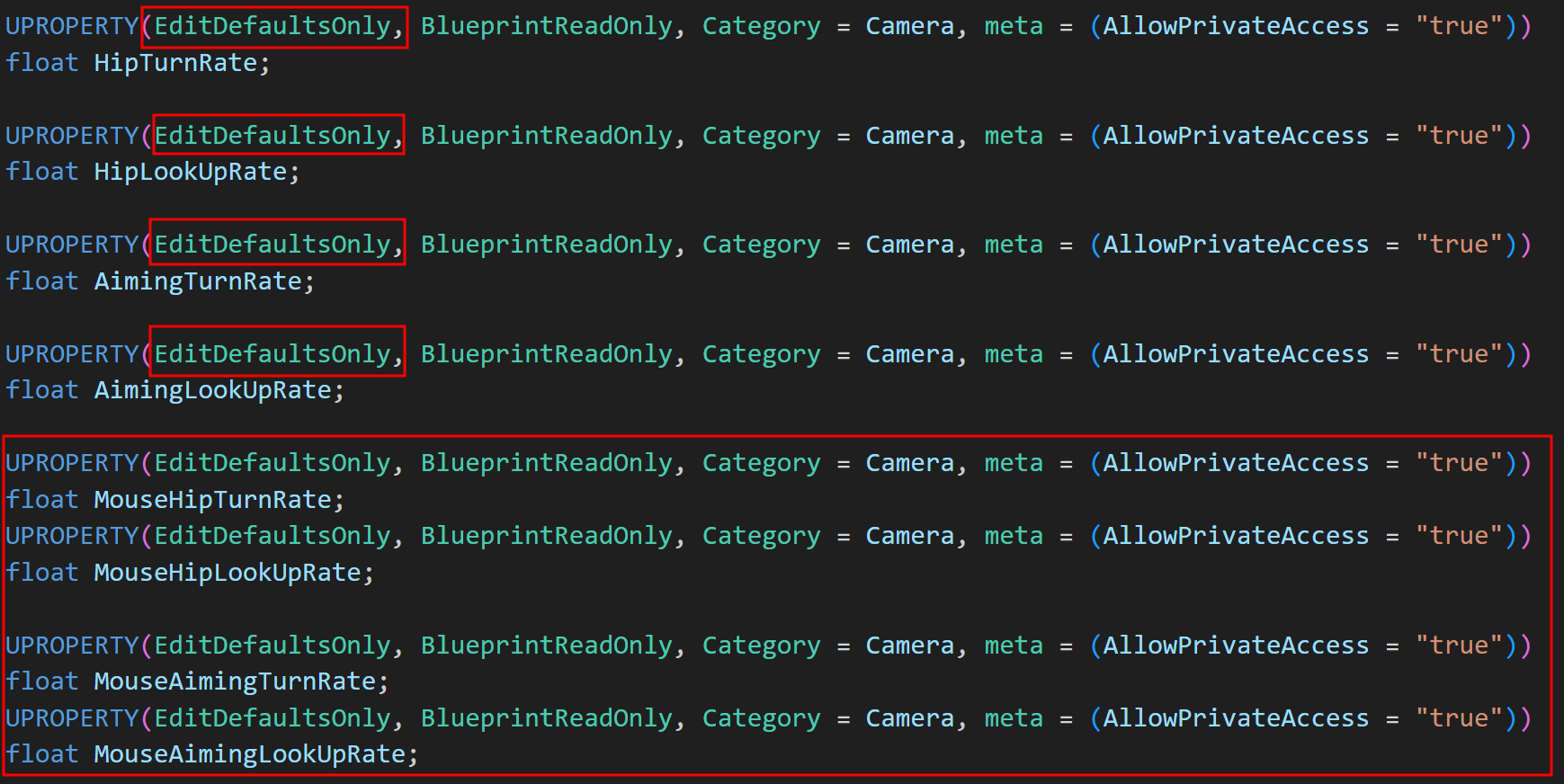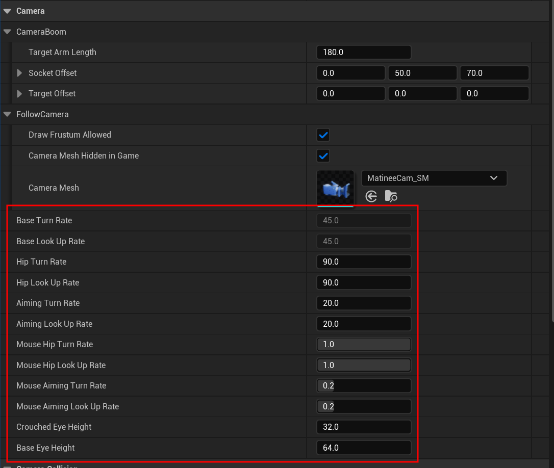 그리고 이전과 포함하여 TurnRate/LookUpRate 값들을 언리얼에서 클래스 기본값에서만 수정가능하도록 바꿔주었다.