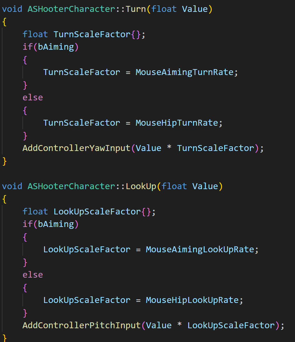 다음으로 기존 AddControllerYawInput / AddControllerPitchInput 함수에 조준 비조준시에 대한 배율을 넘겨주자.