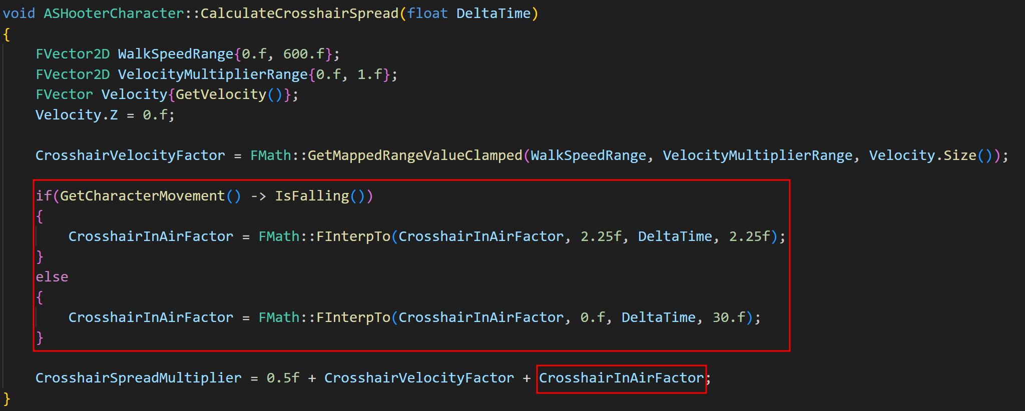 그리고 이를 GetCharacterMovement()에 속한 IsFalling() 함수를 통하여 공중 여부를 판별 후, CrosshairInAirFactor의 값을 설정해주면 된다.