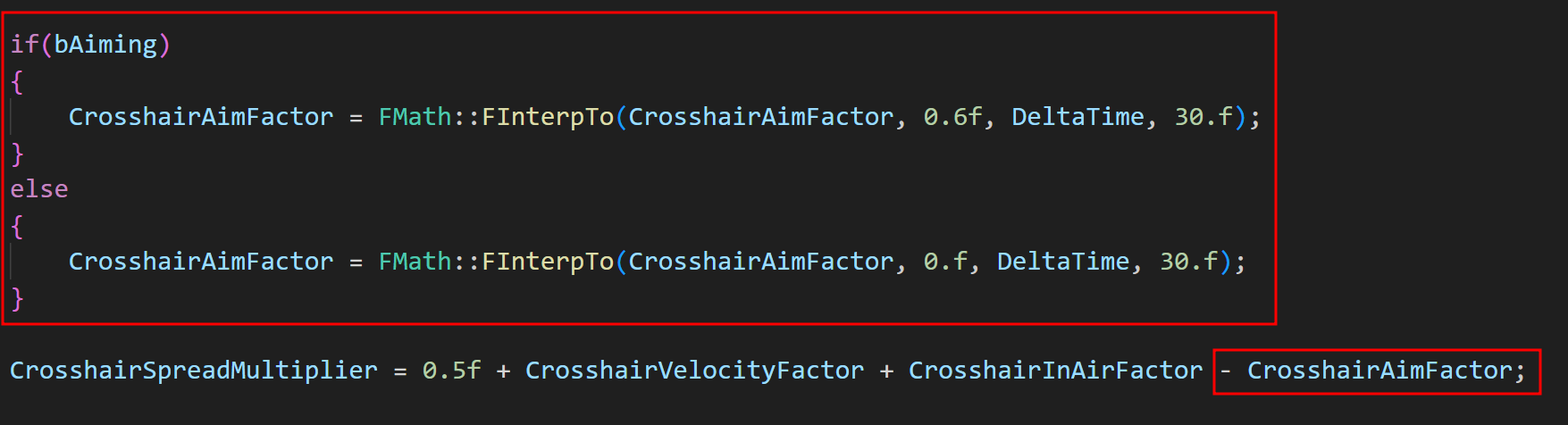조준 할 때는 크로스헤어가 좁혀져야 하므로, 기존에 더해주던 것과 달리 이번엔 기존 값에 빼주게 된다.
