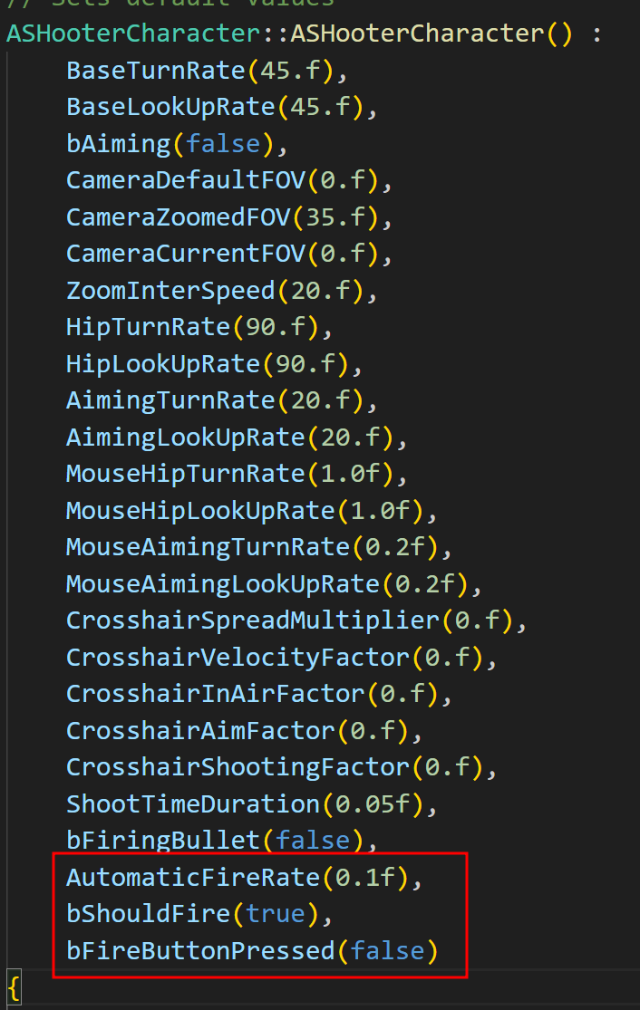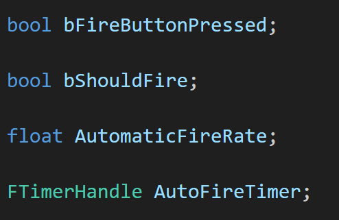먼저 사격 버튼 눌림 여부, 사격해야 하는가에 대한 여부, 자동 사격간 딜레이, 자동 사격에 대한 타이머에 대한 변수를 선언해주었다.