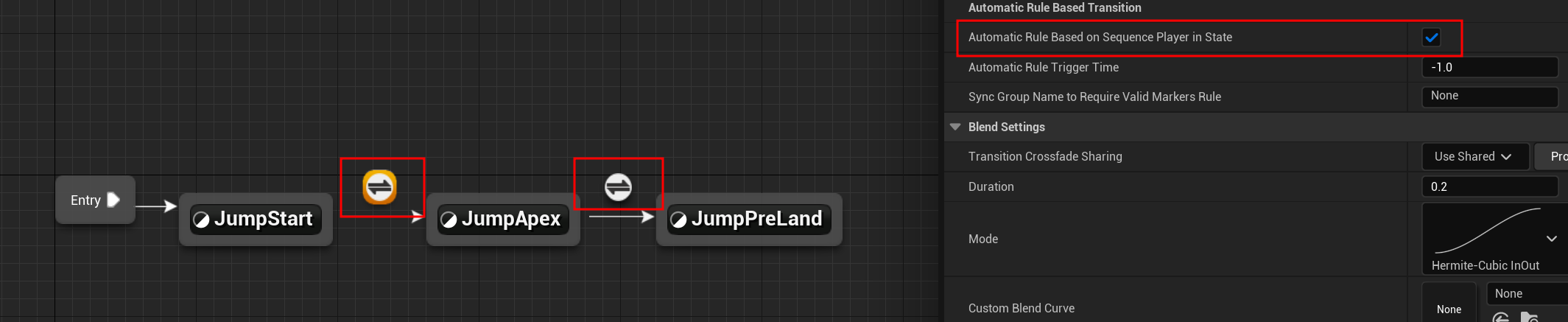 하나는 자연스럽게 넘어가도록 옵션을 걸었고, 나머지 하나는 In Air 여부이다.