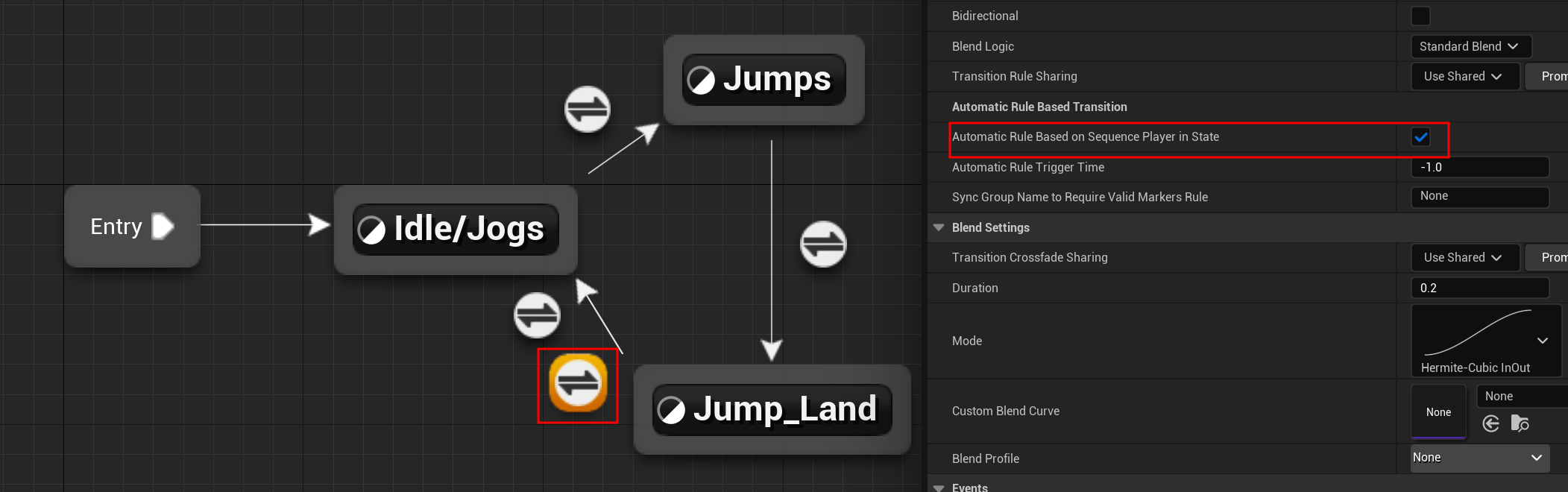 Jump_Land -> Idle/Jogs 에는 2가지 조건을 걸었다.