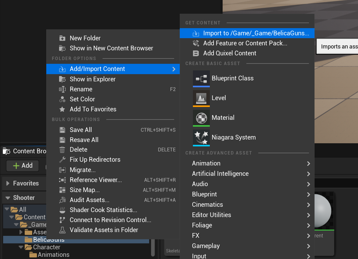 이를 위해 해당 강의에서 2가지 방법을 다루었는데 먼저 따로 총기만 있는 에셋을 다운하여 임포트한 부분이다.