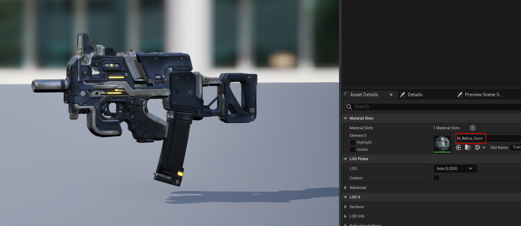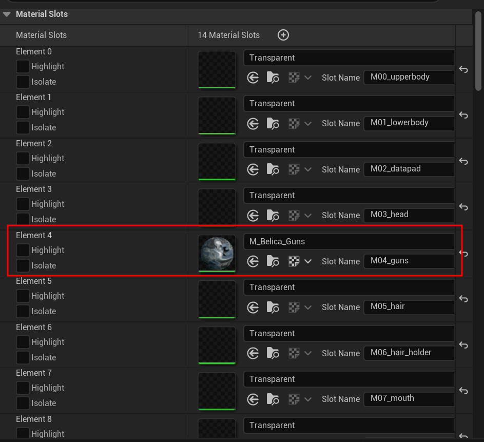 그리고 복사했던 Belica 스켈레톤 메시에서 총기 부분 Material을 다루는 요소 4번을 제외한 나머지 전부를 방금 만들어준 Material로 할당해주자.