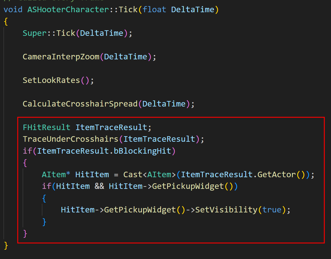 충돌 여부를 판별하고 존재한다면, Cast 함수를 통해 Item 클래스에 대한 변수를 얻고 해당 함수를 통해 PickUpWidget에 접근하여 비활성화 했던 위젯을 다시 활성화해주자.