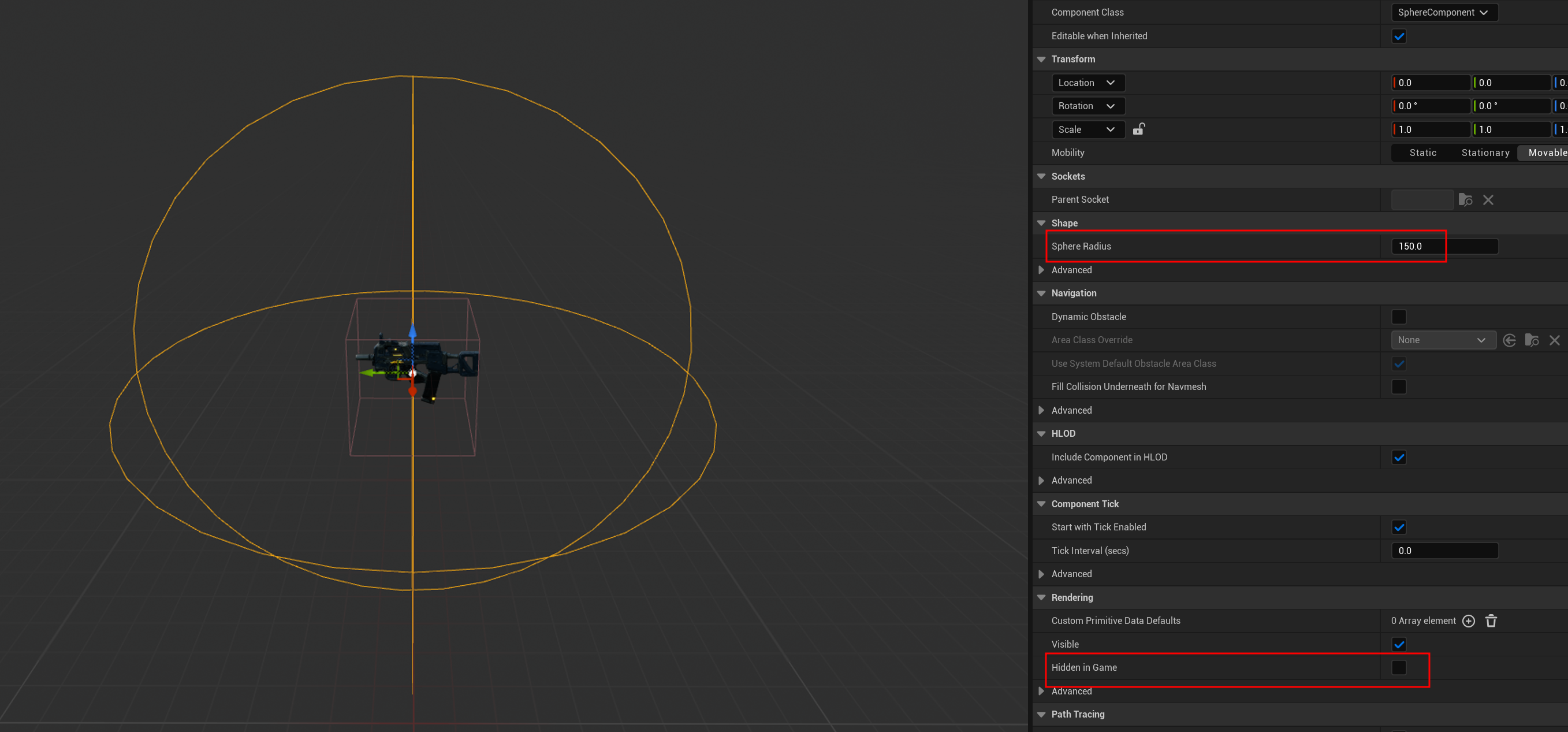 이제 컴파일을 하고 BP_BaseWeapon 클래스에 추가된 Sphere를 확인하자.