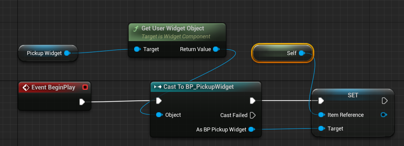 User Widget Object를 얻고, Cast를 통해 이를 Bp_PickUpWidget으로 캐스팅해주고 이를 통해 Item Reference 값을 세팅해주자.