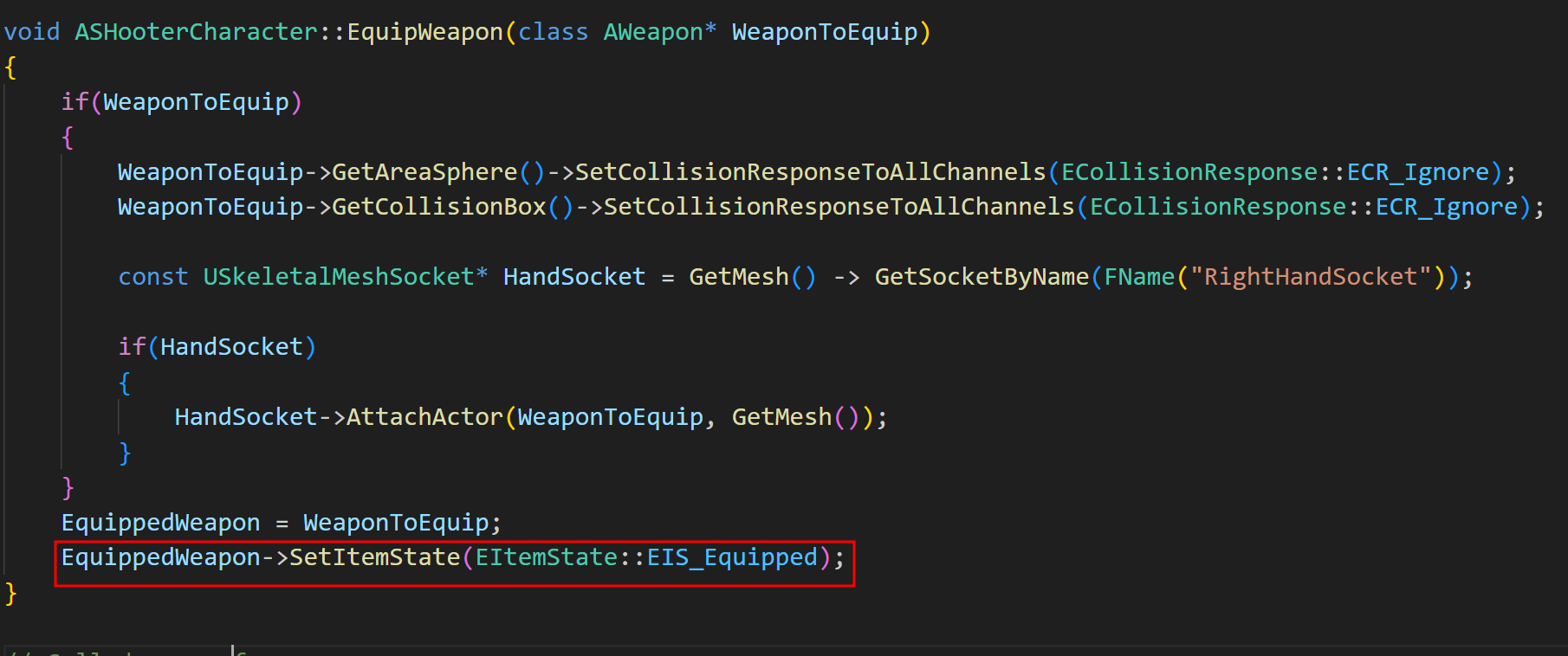 세팅을 통한 getter 함수로 ShooterCharater 클래스의 EquipWeapon 클래스에서 장착된 상태를 알려주자.