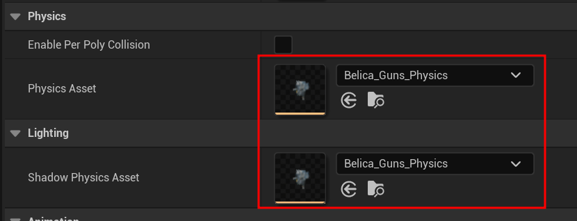 이렇게 만든 것을 기존 Belica_Guns의 Physics와 Lighing 에셋에 할당해주자.