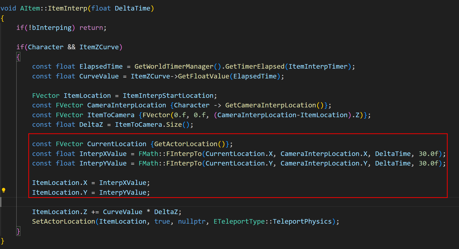 GetActorLocation 함수를 통해 현재 위치를 얻고, FInterpTo 함수를 통해서 보간을 하게 된다.