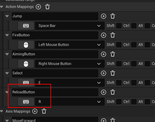먼저 액션 매핑부터다 보통 리로딩은 R키를 할당한다.