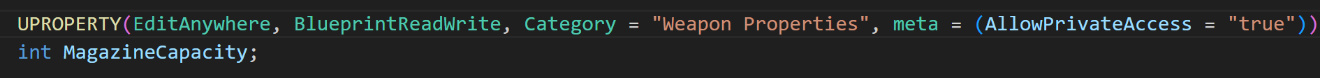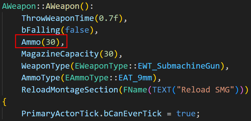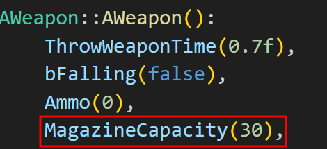 먼저 탄창 용량에 대한 변수를 Weapon 클래스에 선언 및 초기화 해주자.