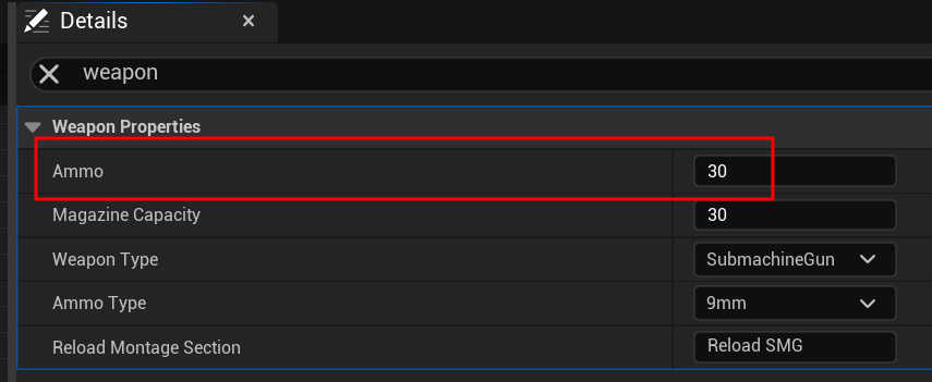 탄창 용량을 30으로 했으므로 탄약 개수 또한 30으로 조정해주자.