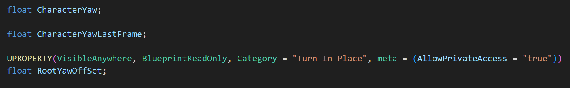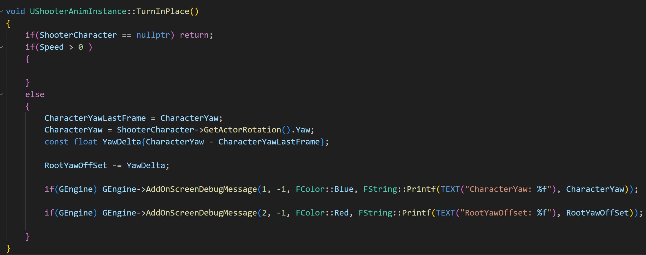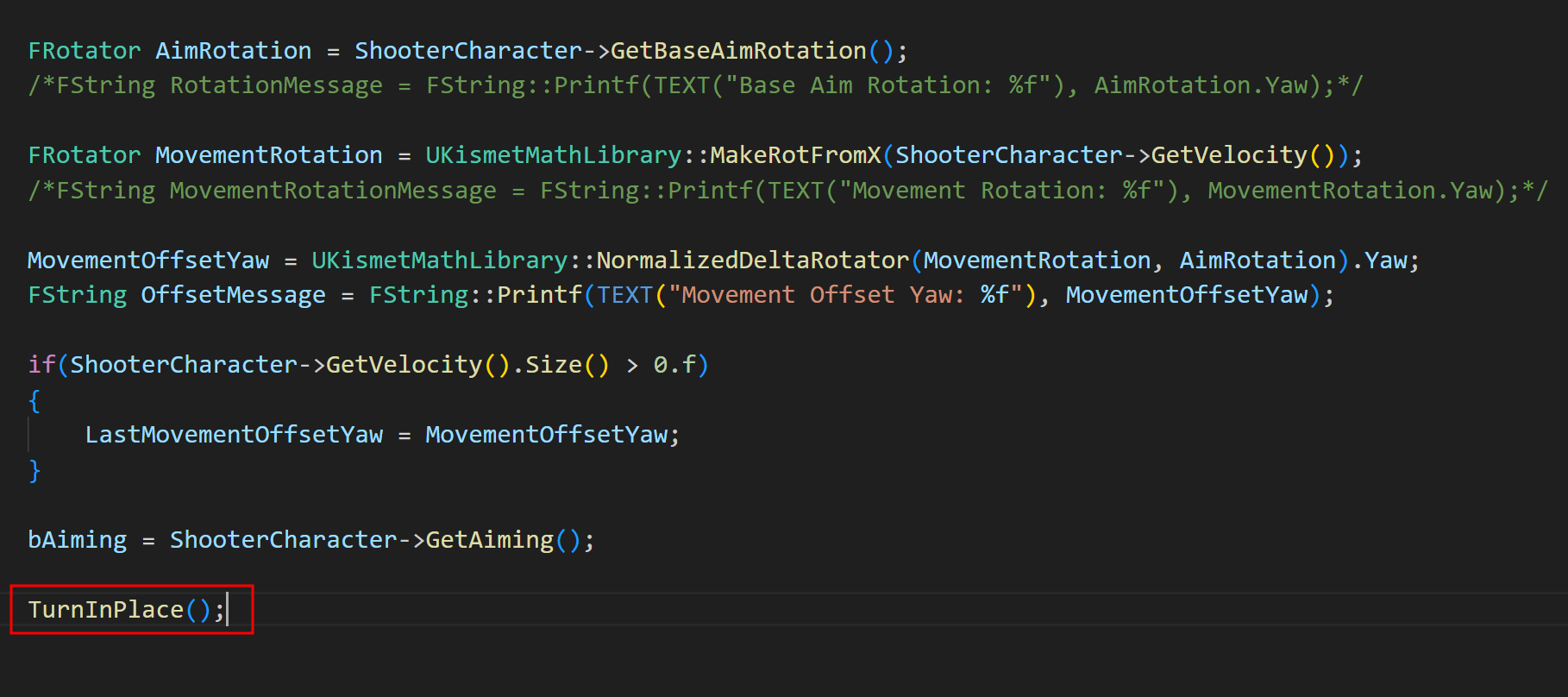 그리고 위에 만든 TurnInPlace() 함수를 UpdateAnimationProperties() 함수에서 호출해주자.