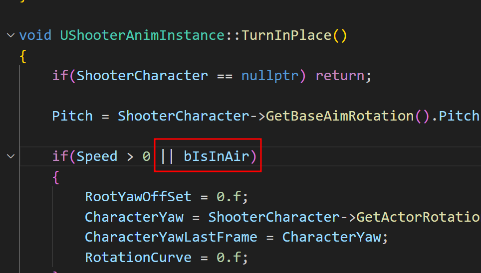 마지막으로 공중에 있을 때도 제자리 회전이 불가하기에 TurnInPlace() 함수에 해당 부분을 추가해주었다.