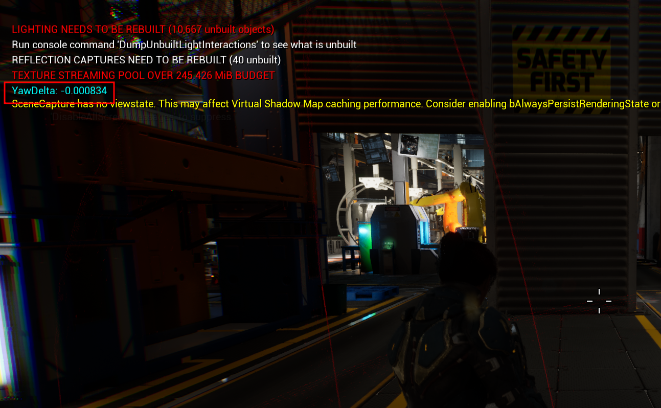 이제 YawDelta 값을 디버깅 메시지로 출력하도록 해서 확인해보자.