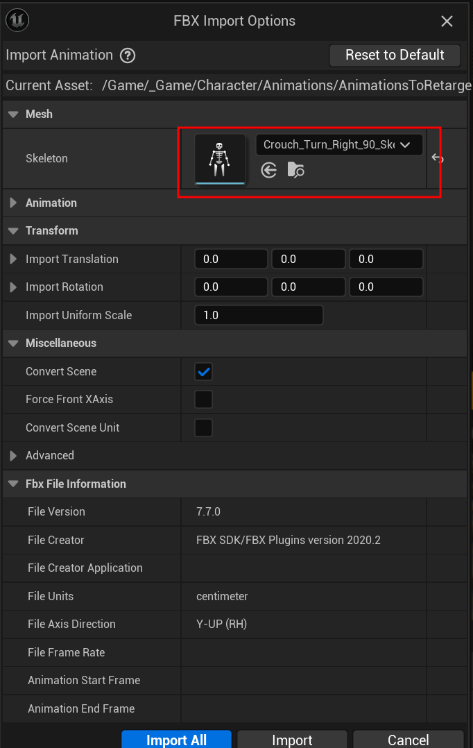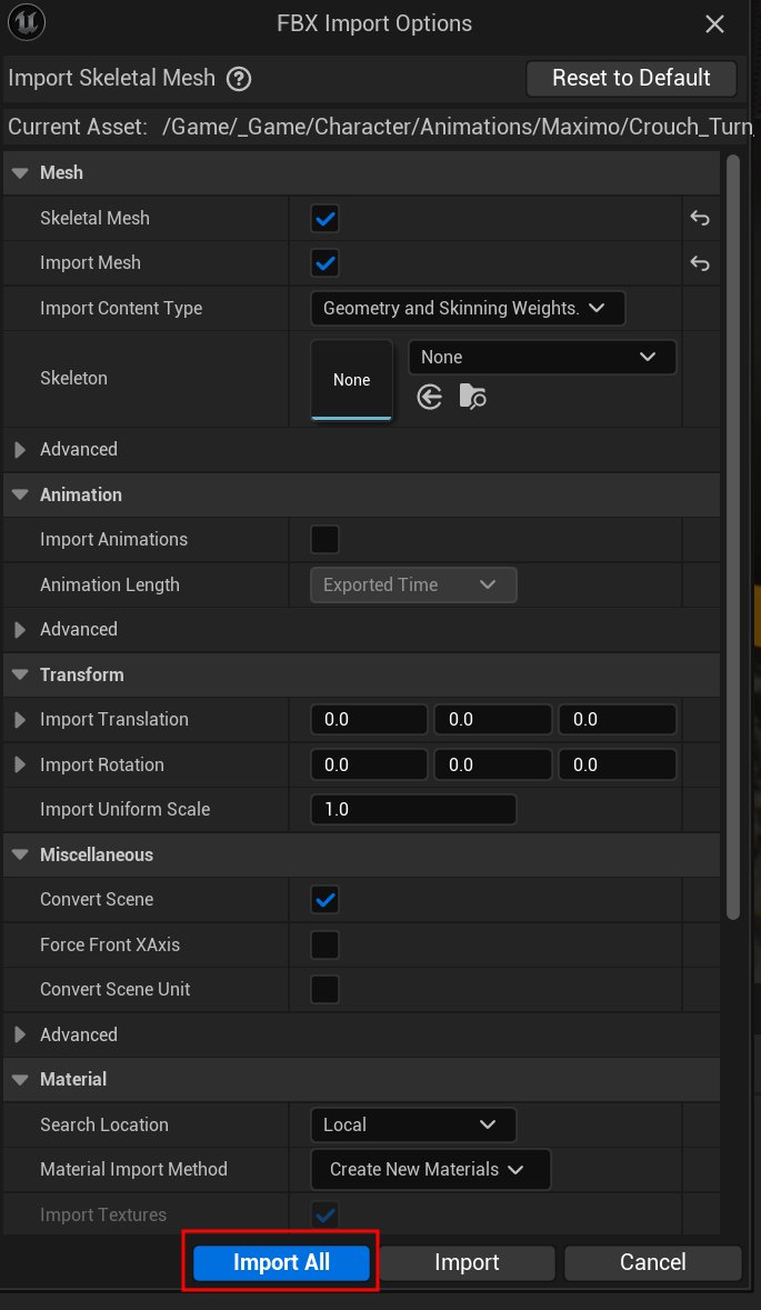 이때 Import Animations도 활성화를 해주어야 해당 애니메이션도 포함된다.