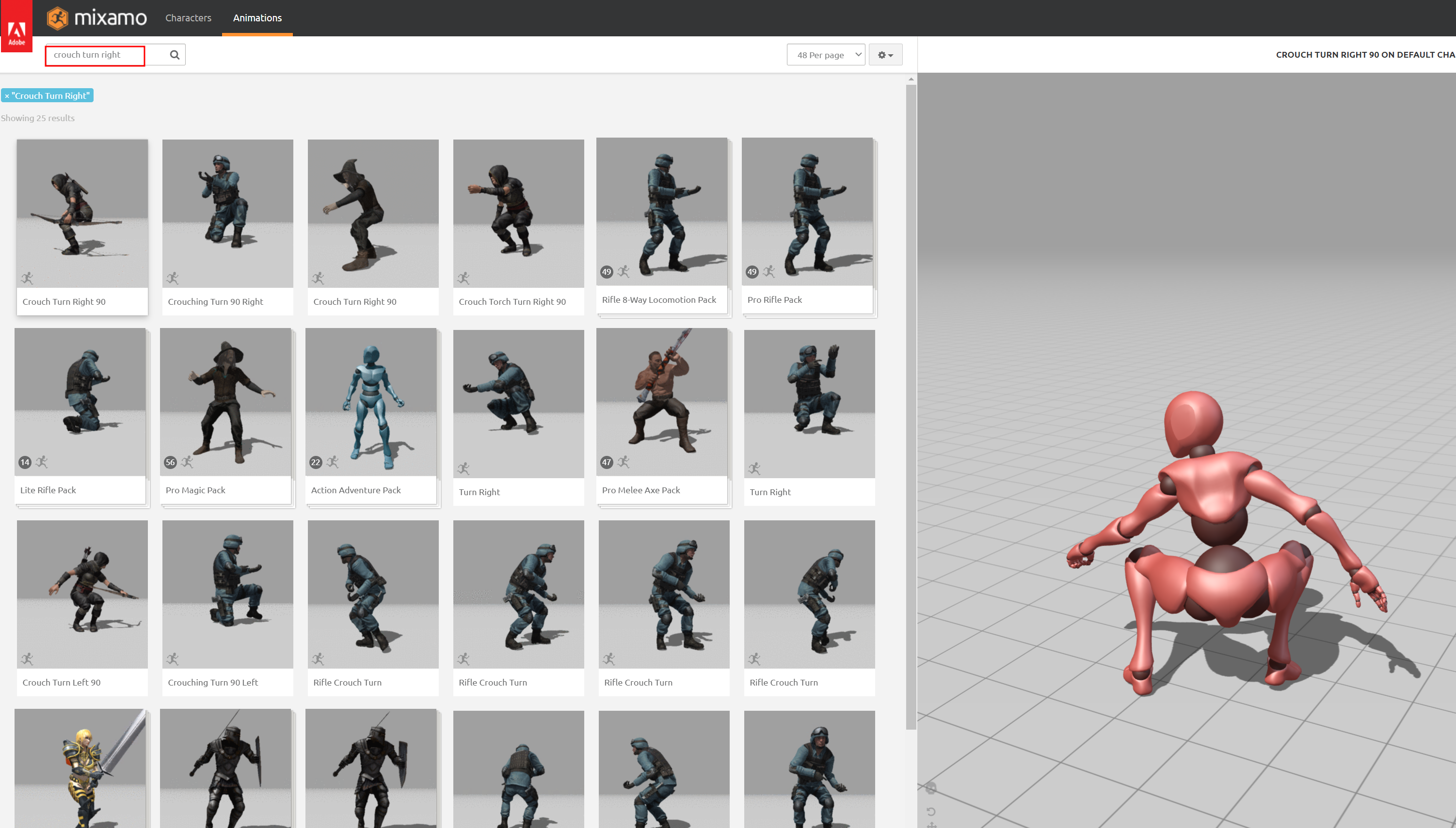 여기서 Crouching 애니메이션을 찾아서 다운로드하자.