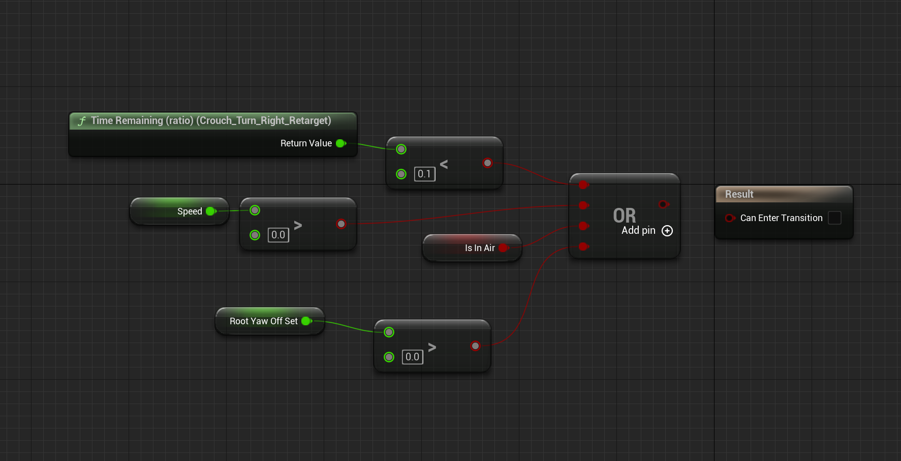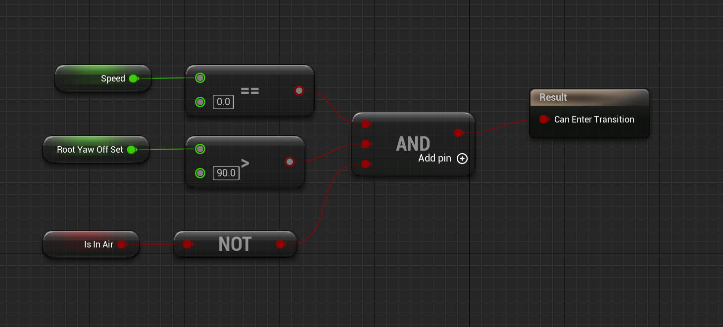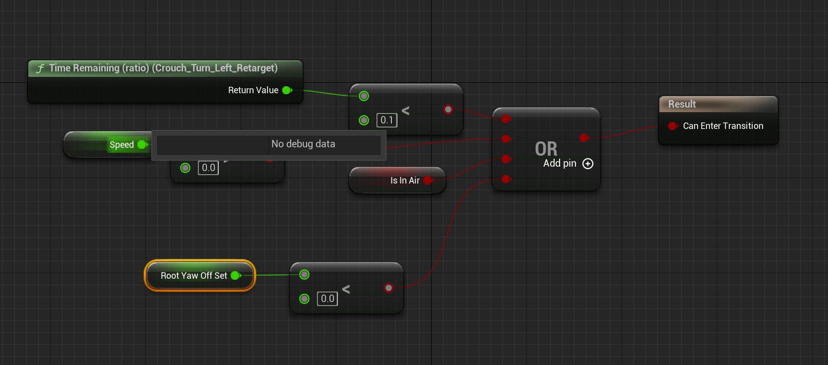 우선 첫 번째로 애니메이션이 끝나가는지 (비율이 0.1 이하인지) 체크하고, Speed가 0 보다 큰지, Root Yaw Offset 값이 0보다 작은지, 공중에 있는지 를 체크하며 하나만 할당해도 회전 애니메이션이 끝나게 된다.