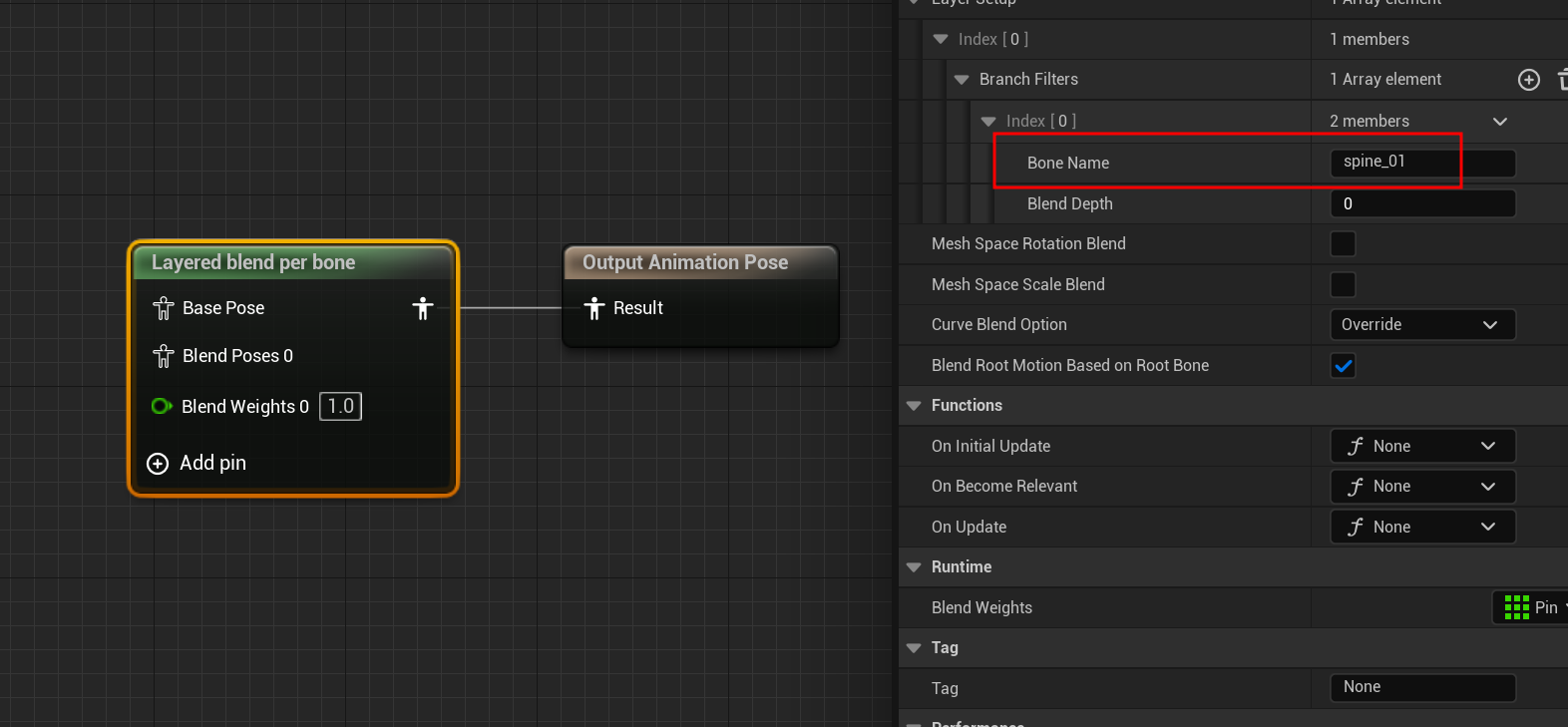 먼저 CoruchIdle 스테이트에서 Layered blend Per Bone 함수를 생성해주자.