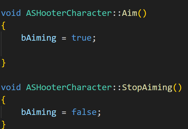 그리고 AimingButtonPressed/Released 함수에 Aim()/StopAiming() 함수들을 호출해 줄 것이다.