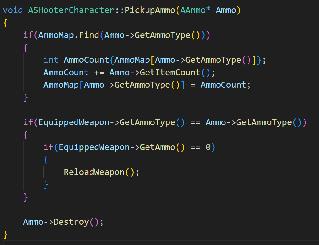 해당 함수를 통해 Ammo가 존재한다면 위 PickupAmmo 함수를 호출시킬 것이다.