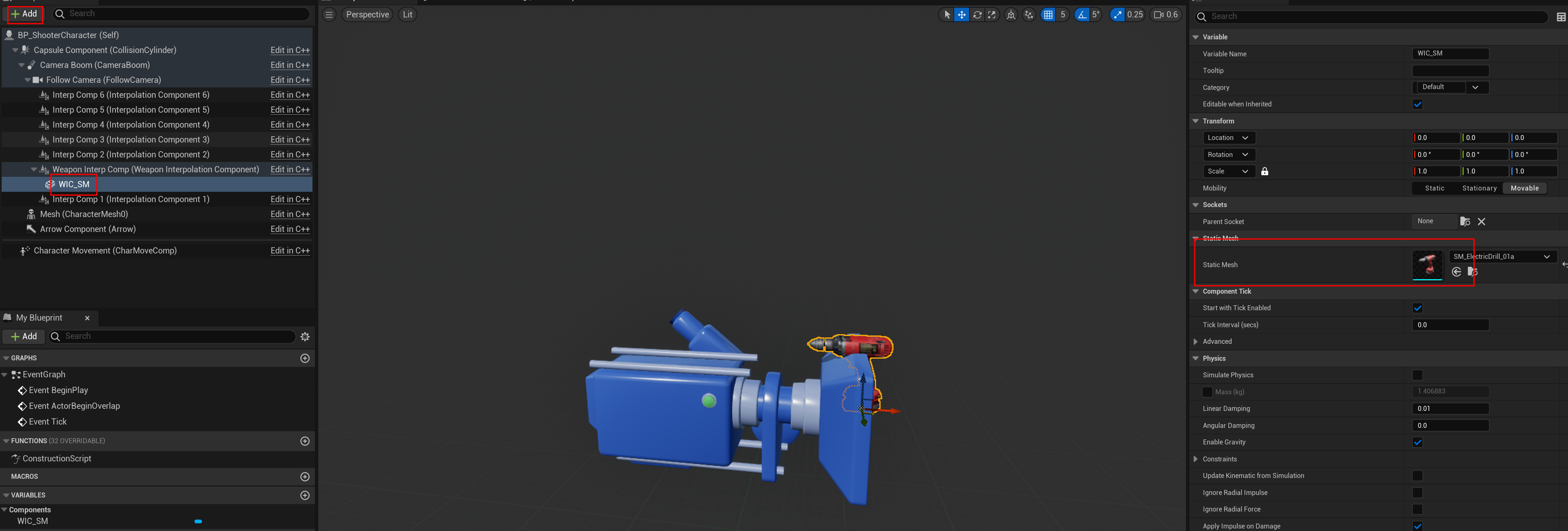 여기서 총기 Mesh는 호환이 불가능한 에셋이여서 일단 임시용으로 강의와 다른 Mesh(드릴)을 할당해주었다.