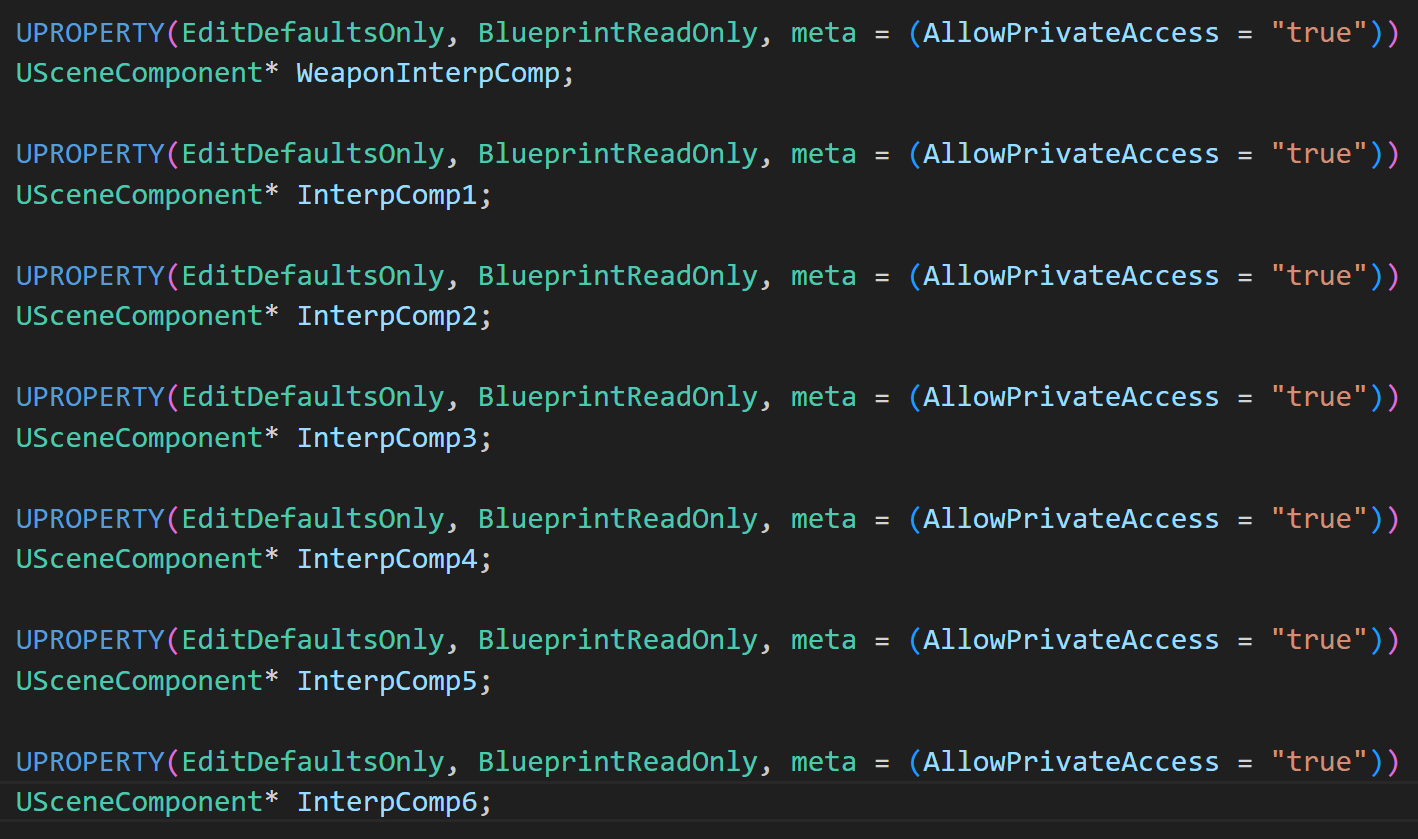 먼저 이를 USceneComponent로 다루게 되며, 무기 1개 탄약 6개에 대한 변수를 선언해줄 것이다.