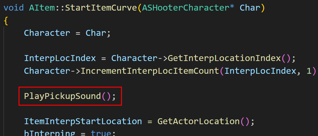 EquipSound()의 경우 ShooterCharacter 클래스에 있는 GetPickupItem() 함수에서 호출하므로,