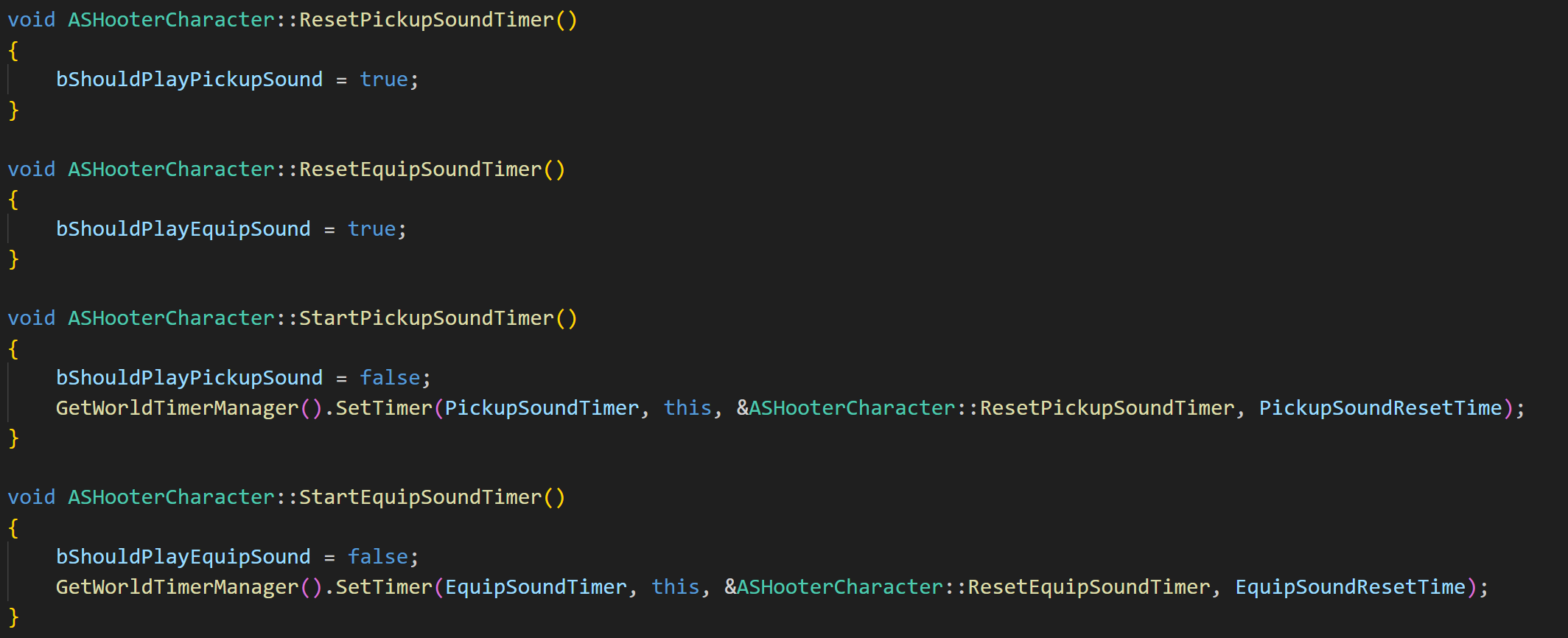 타이머 시작함수들은 각 Sound 값을 false로 만들고, SetTimer() 함수를 호출한다.