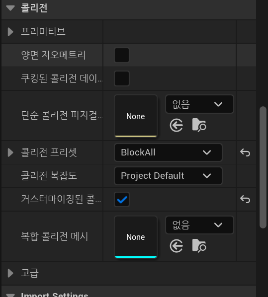 위 화면은 스태틱 메시 패널을 통해서 콜리전을 설정해준 상태이다.