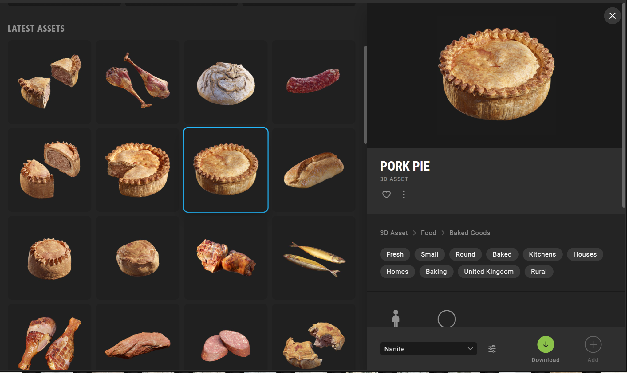 원하는 에셋을 고르면 우측에 처음에는 Nanite라는 항목과 그 옆에 다운로드, 추가버튼이 보일 것이다.