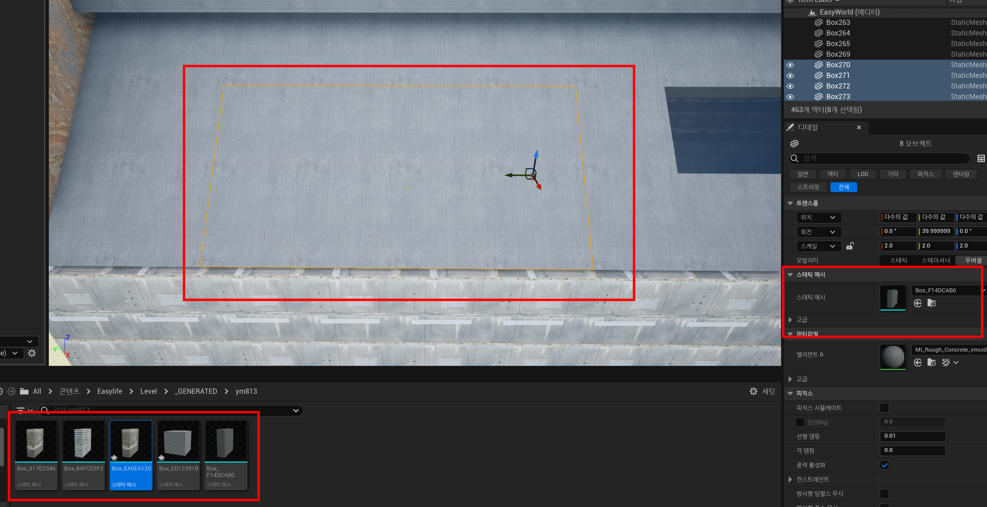 새롭게 만든 Box에 Ctrl + B를 눌러서 콘텐츠 브라우저를 통해 새롭게 생성된 스태틱 메시를 확인이 가능하다.
