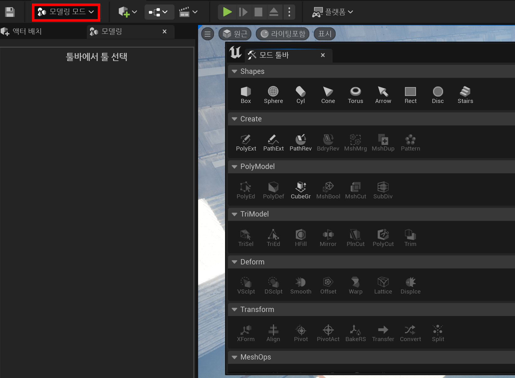 좌측 상단의 선택모드를 모델링 모드로 바꿈으로써 모델링 툴을 사용할 수 있다.