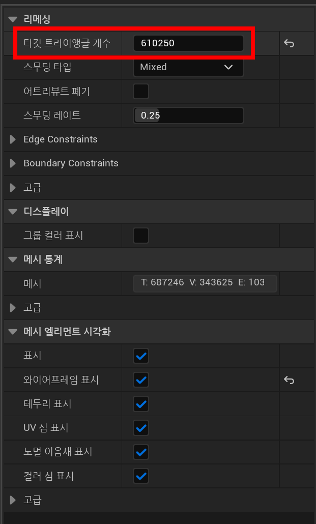 위 사진의 타깃 트라이앵글 개수를 조절함으로써 몇 개의 폴리곤으로 구성할지 조절할 수 있다.