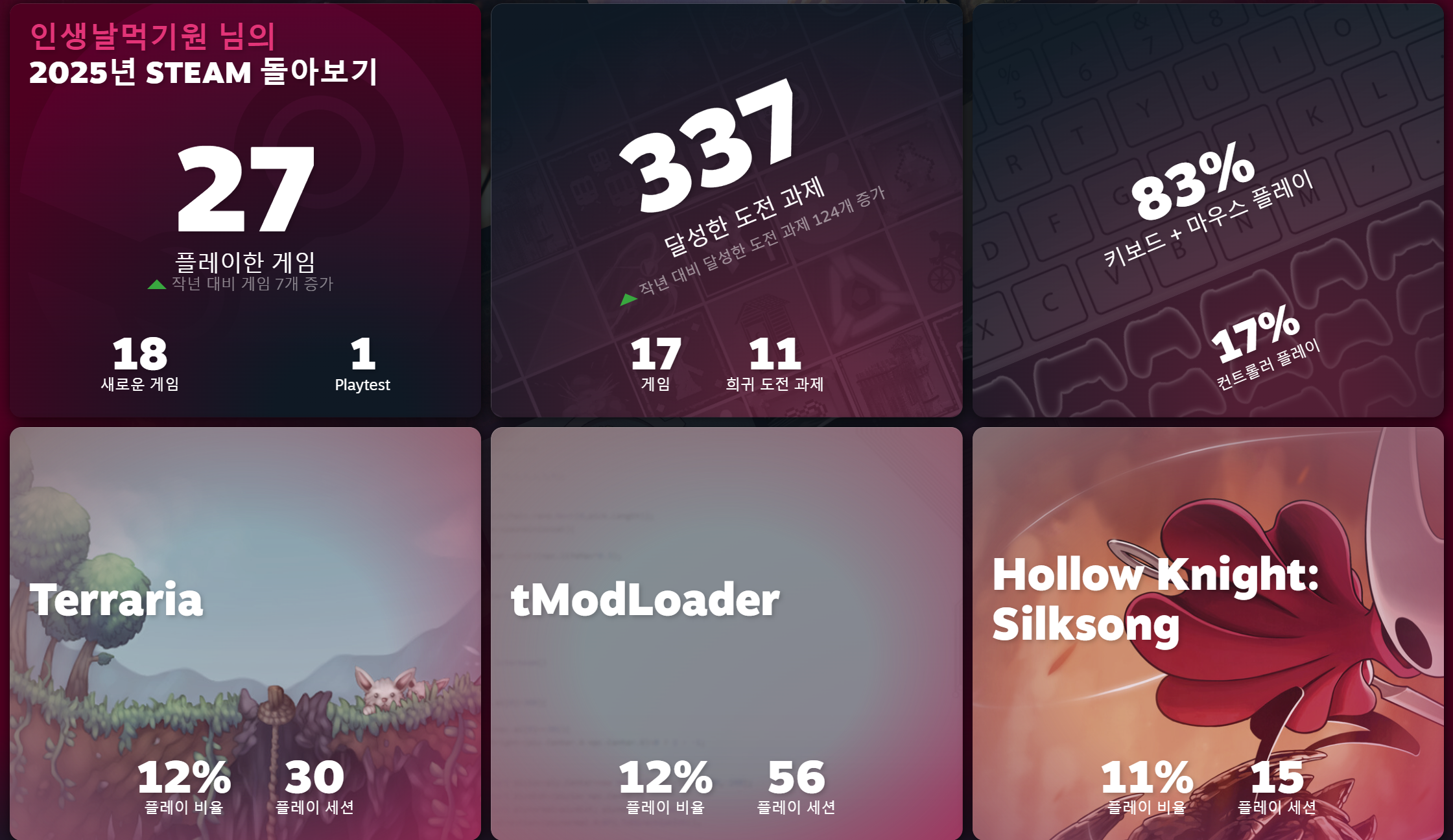 올해는 Silksong, Monster Hunter Wilds, Clair Obscur: Expedition 33, Split Fiction, Escape from Duckov, Peak 등전반적으로 즐길 게임이 무척 많았던 해라, 덕분에 상당히 행복한 시간을 보낼 수 있었던 것 같다.