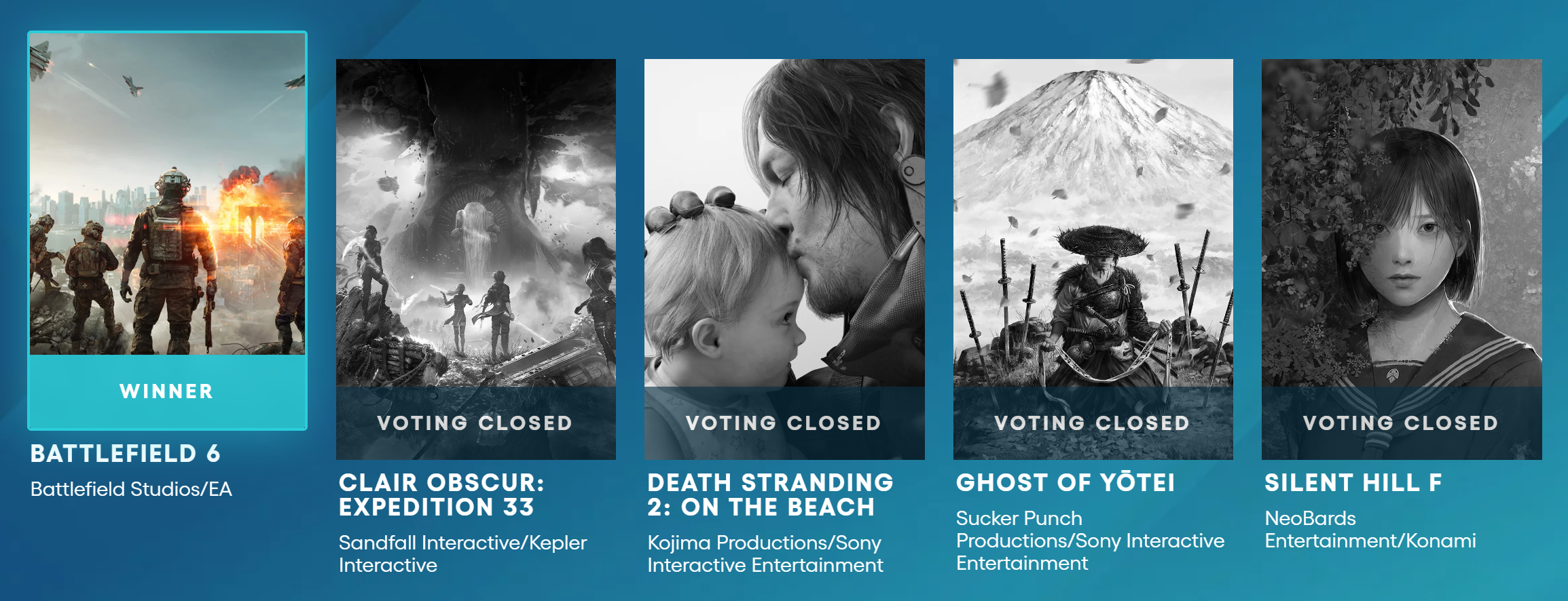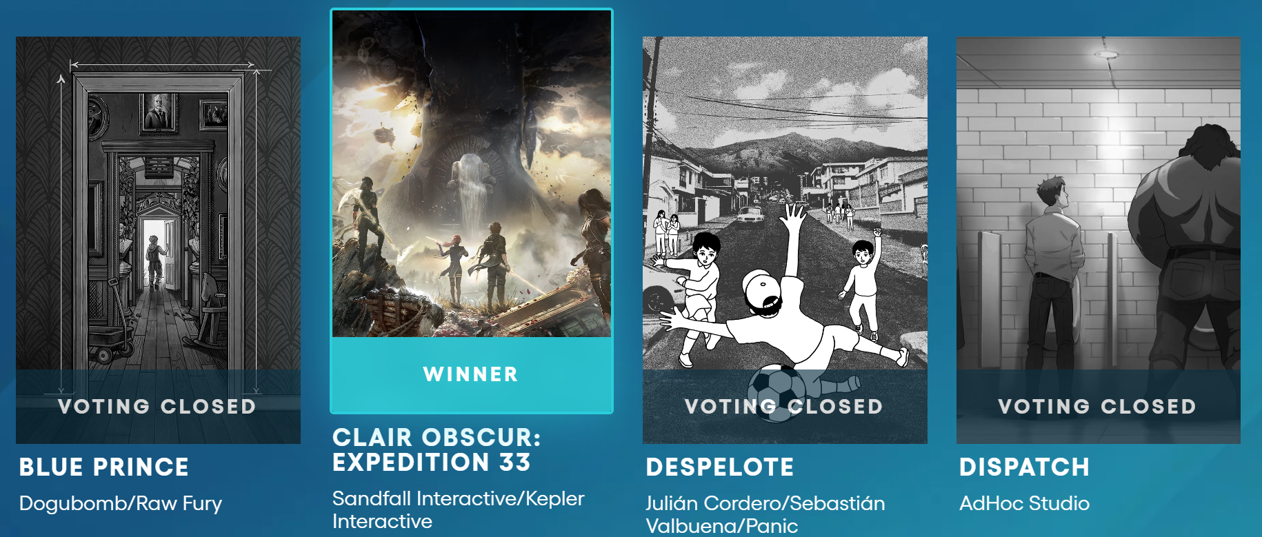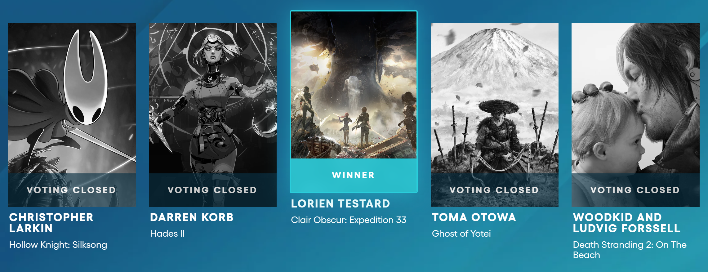 | 개인 후기 | 여기서도 CLAIR OBSCUR: EXPEDITION 33가 수상했다. 개인적으로는 해당 게임의 스토리텔링 및 캐릭 서사가 뛰어난 것은 맞으나, 처음 원정대의 서사에 매력을 느끼고 플레이 했었기에 후반부로 갈수록 방향성이 변화하는 스토리에 살짝 아쉬움을 느꼈던 것 같다. |