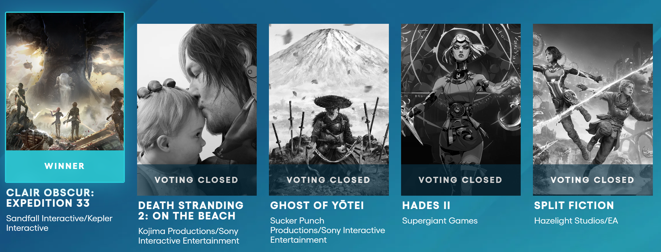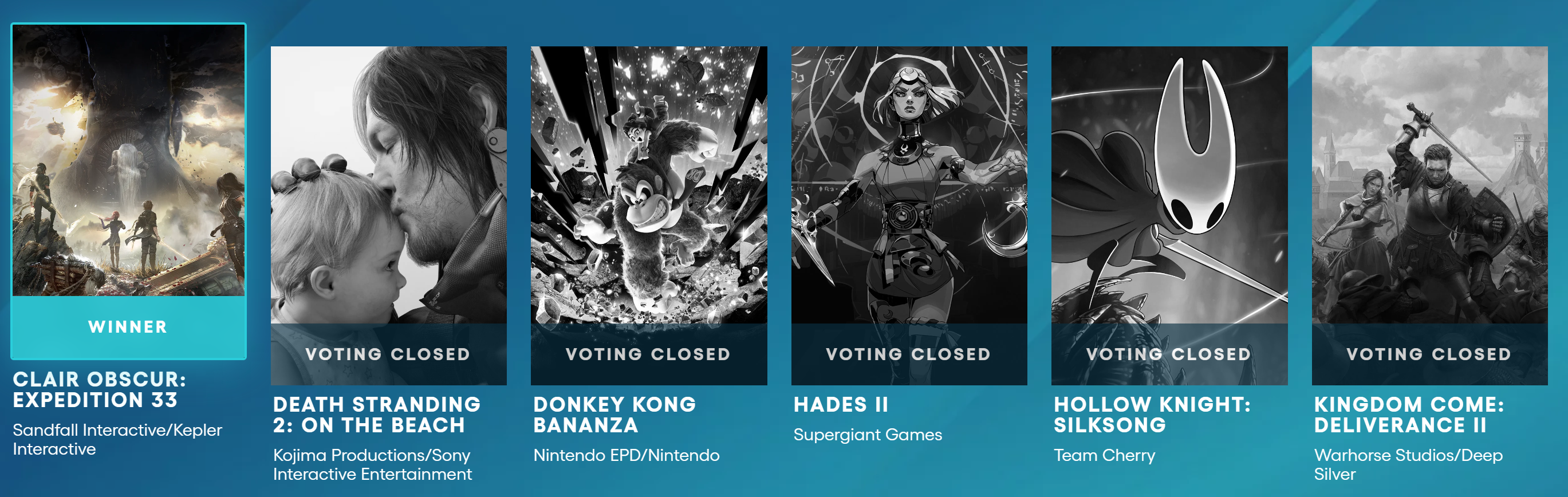 | 개인 후기 | 출시 트레일러에서부터 많은 호평을 받은 CLAIR OBSCUR: EXPEDITION 33이 수상했다. 해당 게임이 유명해지기 전부터 출시 트레일러를 보고 몽환적이고 수채화같은 그래픽에 굉장히 큰 인상을 받았었다. 다른 게임들도 워낙 유명해서 이미 충분히 훌륭한 게임들이지만, 전부 후속작에 해당하기 때문에 처음 선보이는 33원정대가 제일 높은 평가를 받을 수 밖에 없다고 생각한다. |