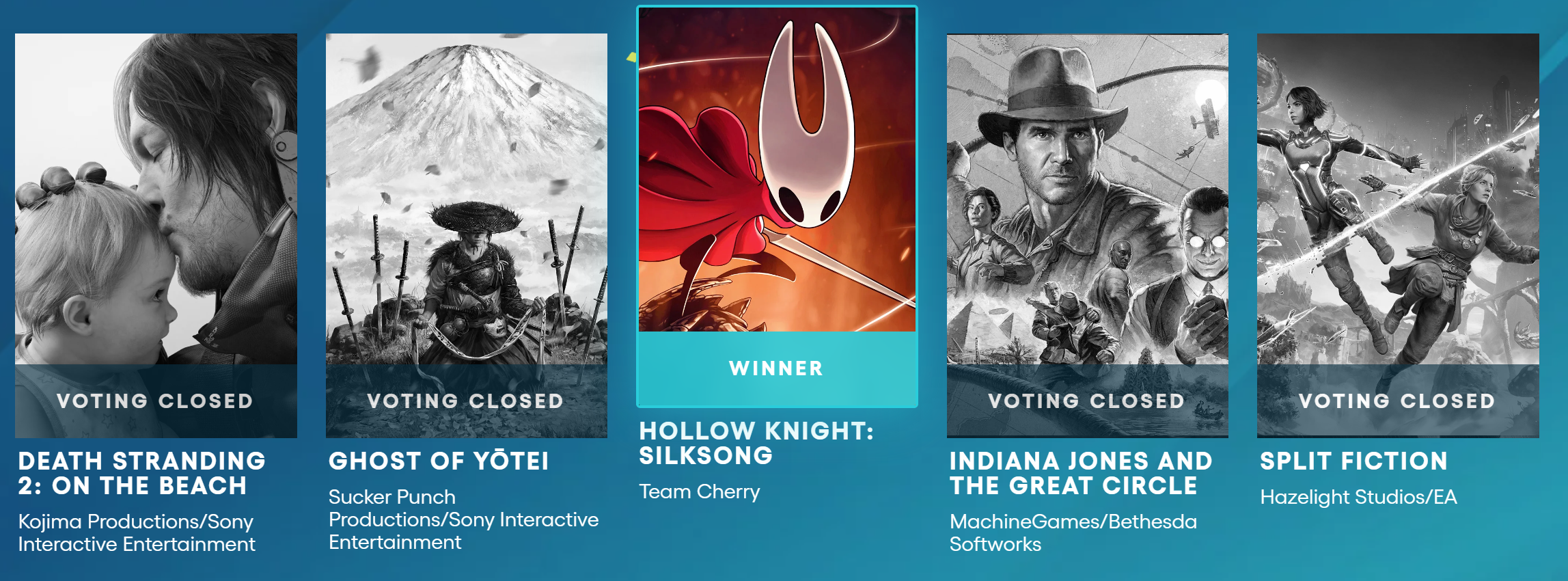 | 개인 후기 | 올해 최고의 화제작 중 하나로, 매트로배니아 명작 Hollow Knight의 후속작이다. 워낙 인기 있는 장르인 만큼 후보작들 모두 뛰어난 게임들인데, Split Fiction을 특히 재미있게 플레이했다. 인디아나 존스의 경우, 원작이 있는 작품을 기반으로 한 게임을 개인적으로는 선호하지 않는 편이다. 이미 세계관을 알고 있다보니, 새로운 세계를 처음 접하는 느낌이 줄어들어 몰입감이 다소 깨진다고 느끼는 것 같다. 해당 게임 자체의 완성도는 상당히 높아, 인디아나 존스를 즐겨온 팬이라면 누구나 호평할 만한 작품으로 기억한다. |