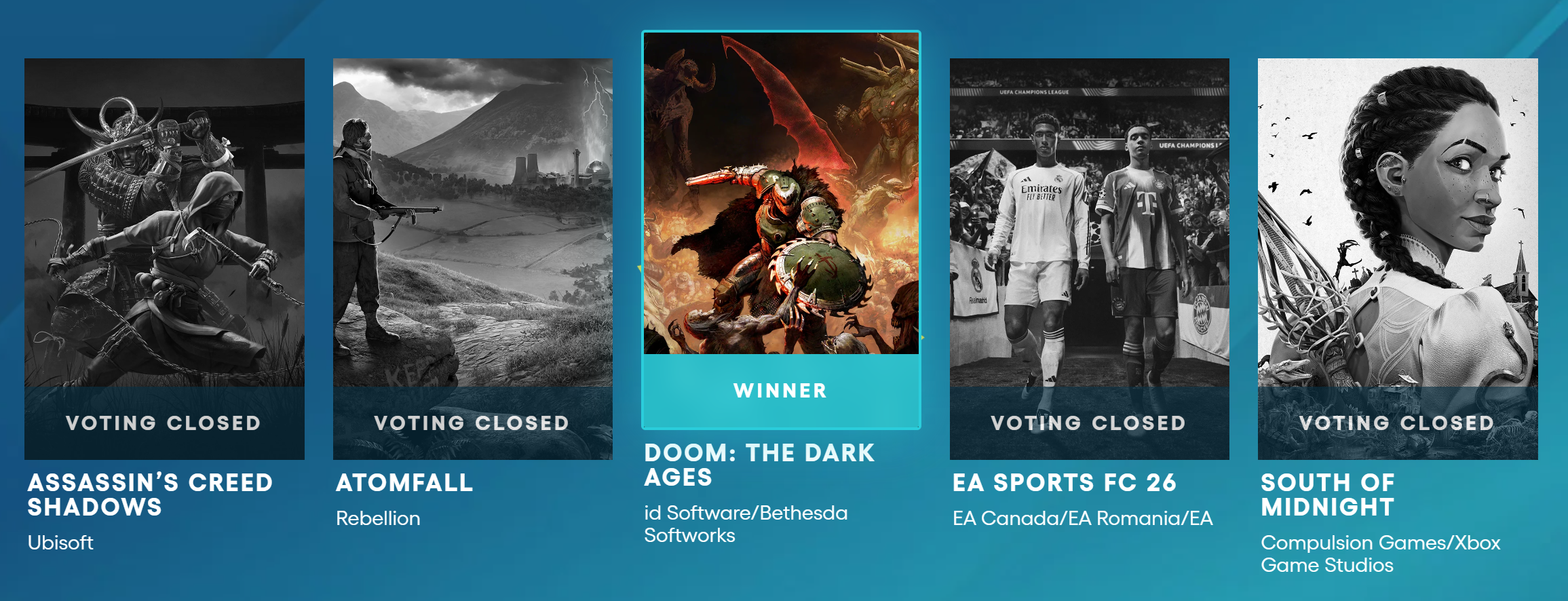 수상작은 DOOM 시리즈의 최신작 DOOM: THE DARK AGES가 수상했다.