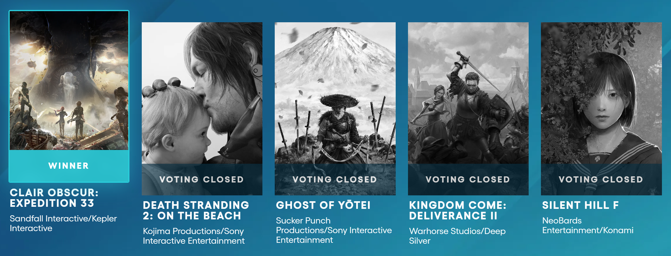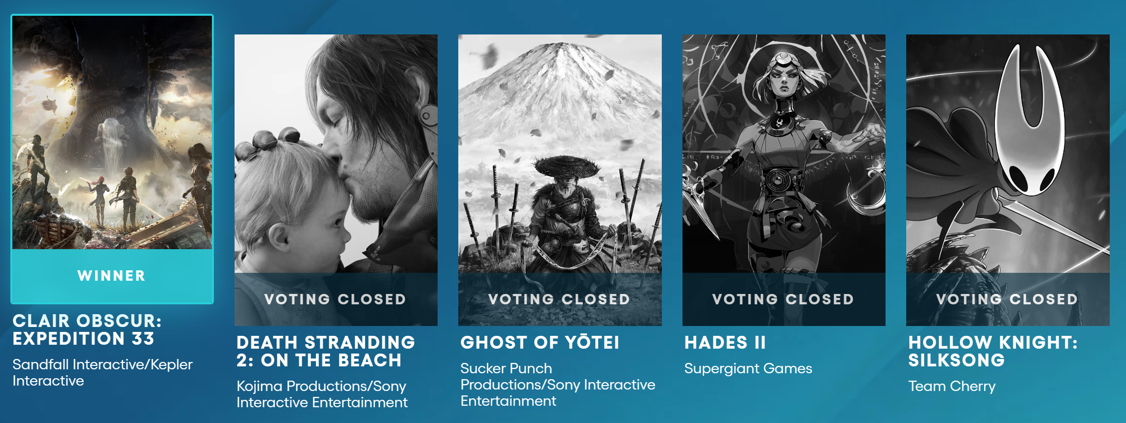 최종적으로 지금까지 수많은 상을 수상한 Clair Obscur: Expedition 33가 GOTY까지 차지하게 되었다.