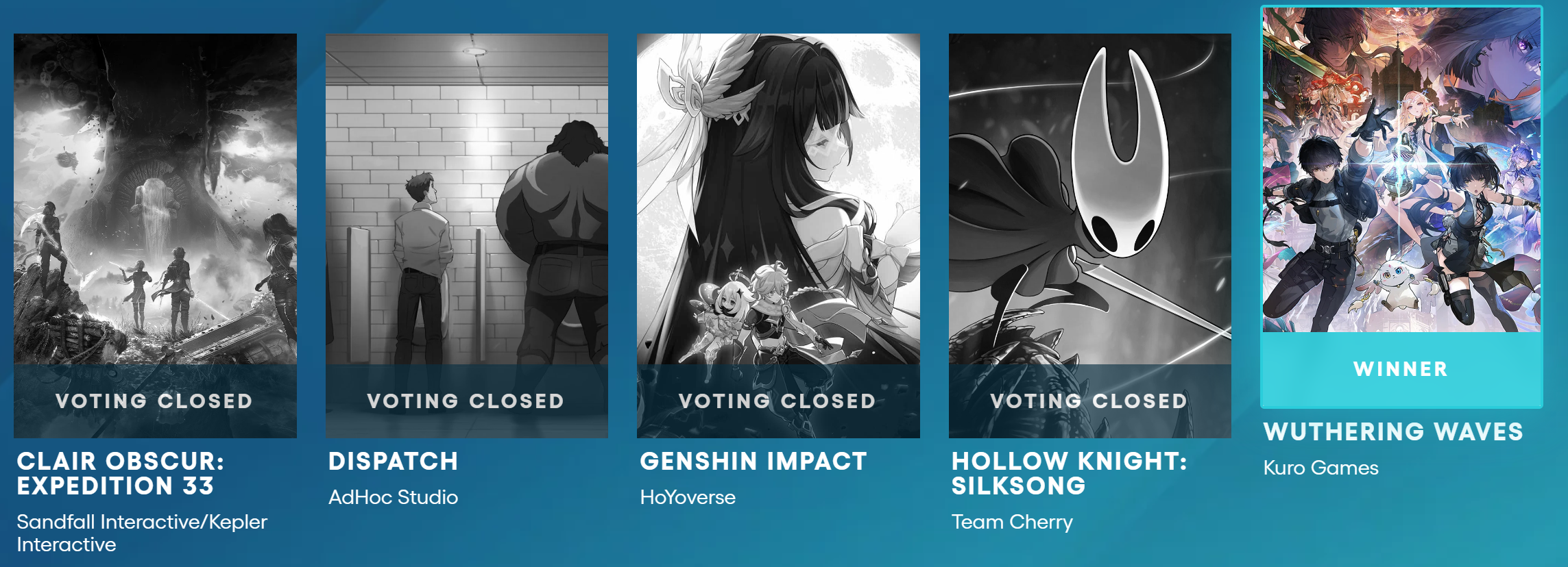 | 개인 후기 | 중국의 유명 서브컬처 게임이다. 원신의 인기가 국내에서도 엄청나기에 당연히 원신이 수상받을 줄 알았는데, 명조가 원신을 투표로 이길 줄은 몰랐다. |